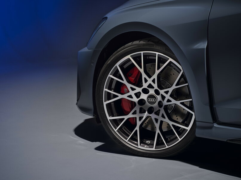 De sportieve RS-zijdrempels versterken de krachtige uitstraling met een inleg in carbon². Daarnaast zorgen 19-inchvelgen², die u als optie kunt bestellen in het opvallende autosportdesign van de Audi RS 3 LMS, voor een expressieve uitstraling.