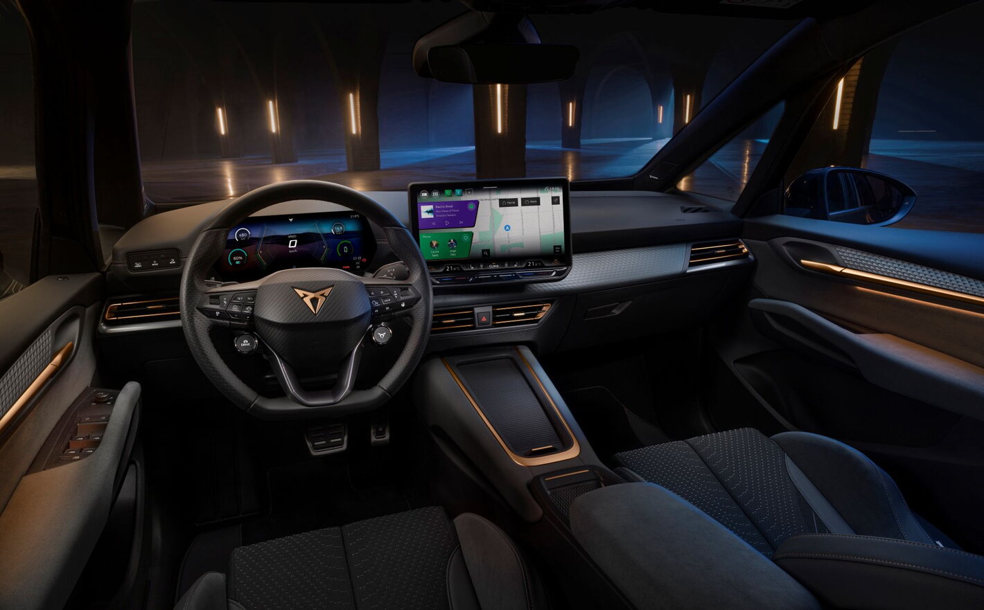 Het interieur van de nieuwe CUPRA Born ademt sportiviteit met standaard kuipstoelen en een flink grotere, 10,25 inch Digital Cockpit. Dit nieuwe, kristalheldere display biedt een indrukwekkend overzicht. Dankzij het sportstuur met fysieke knoppen en hoogwaardige koperen accenten is het CUPRA gevoel compleet.