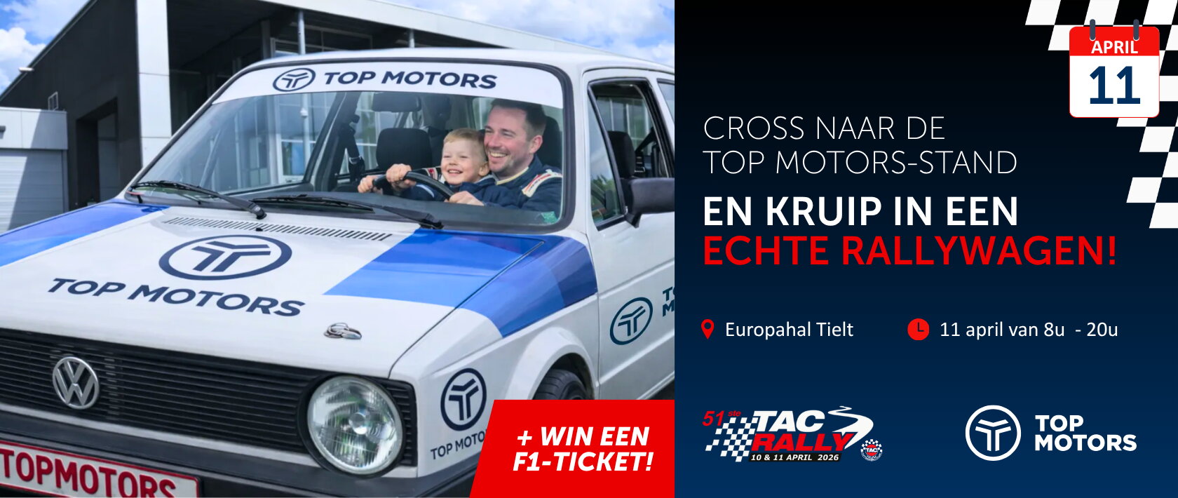 We hebben een ronkende paasvakantietip voor jonge (en oudere) rallyfans. Zeker voor de kleine piloten die ervan dromen om eens in een echte rallywagen te zitten. Op het servicepark van de TAC Rally Tielt kan je niet alleen de buitenkant van de wagens bewonderen. Want dankzij Top Motors kruip je zélf ook eens achter het stuur. En dat in een VW Golf 1 GTI, maar ook in een authentieke Audi Ur-Quattro, een echt rallymonster. Maak bovendien kans op een ticket voor de F1 Qualifiers in Spa-Francorchamps! We verwelkomen je met plezier (en met een drankje 😊). Tot dan!