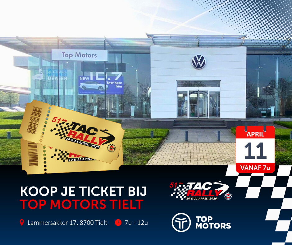 TIP: koop je TAC Rally ticket op zaterdagmorgen 11 april bij Top Motors Tielt vanaf 7u00 tot 12u00. 📍 Volkswagen showroom - Lammersakker 17, 8700 Tielt.